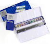雖然塑膠盒包裝比較輕便,但是鐵盒裝的它是實用的12色基本款,加上調色區域比較大、裡面還有許多空間,能再另外購買單顆塊狀顏料作補充。說到它的最大優點則是體積小不佔空間、好收納,並且只要避免放在高溫或是太潮濕的地方,通常都可以保存幾十年不會變質。